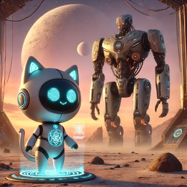 একটি দূরবর্তী গ্রহ, যেখানে ধুলোঝড়ের মাঝে দাঁড়িয়ে আছে ক্যাটি-বট। তার চোখের নীল আলো জ্বলে উঠছে, আর সে সামনে বিশাল এক ধাতব রোবটের দিকে তাকিয়ে আছে। এই রোবটই সেই প্রাচীন গার্ডিয়ান, যার মেমোরিতে লুকিয়ে আছে এক হারানো সভ্যতার গোপন রহস্য।