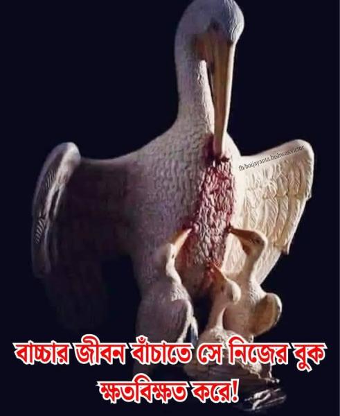পাখিটির নাম পেলিকান। যখন এদের চরম খাদ্য সংকট দেখা দেয়, তখন "মা" পাখি নিজের বুক এভাবে ক্ষতবিক্ষত করে। আর সেই ক্ষতস্থান থেকে বের হওয়া রক্ত পান করে বাচ্চারা জীবন বাঁচায়।