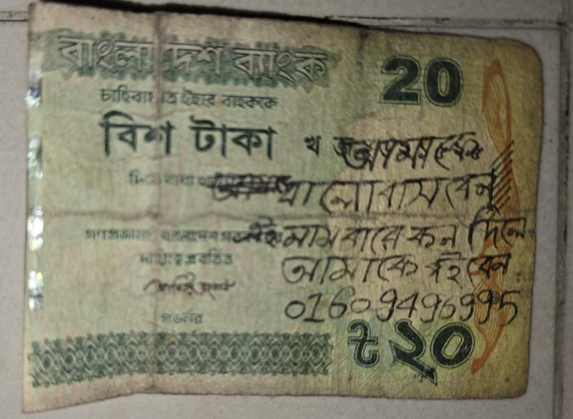 কিন্তু অত ভালোবাসা প্রেম নিজের ভিতর জমা রাখতে রাখতে দম বন্ধ হওয়ার অবস্থা তার। শেষে বেছে নিলেন বাংলাদেশ ব্যাংককে যারা 'বাহককে চাহিবা মাত্র ২০ টাকা দিতে বাধ্য থাকিবে' বলে ২০ টাকার নোট ছেড়েছেন।