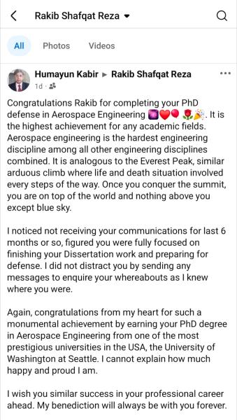 ফেসবুকের দুইমাত্র ভালো দিক, আমি স্যারকে খুজে পেয়েছি এখানে। আমি যে আকাশে তারা দেখে পথ হাটতে শিখেছি, তার কারন তিনি। আমি যে জানতাম আমি জীবনে কি হতে চাই, তার কারন তিনি। আমি যে বুকভরে আমার সাদা চামড়ার ছাত্রদের বলেছি আমি বাংলাদেশের মানুষ – তার এক কারন Dr Humayun Kabir, The father of Unmanned Aerial Vehicle – UAV.