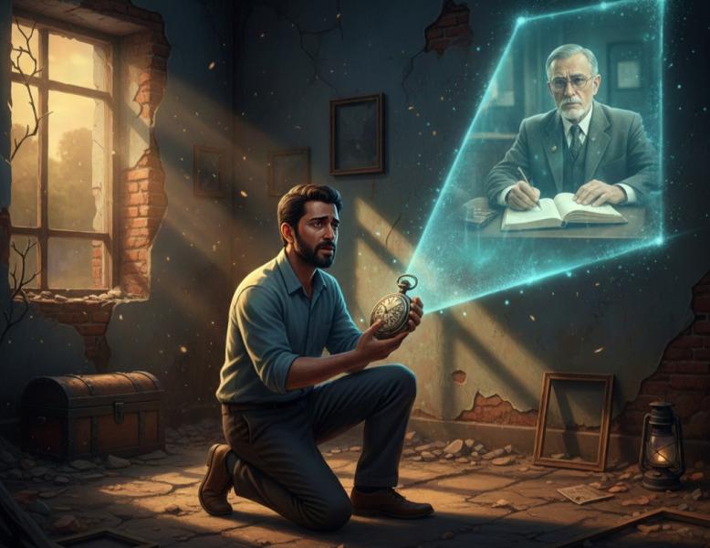 রাফি যখন ঘড়িটির নব (Knob) ঘোরাল, ঘরের ভেতরের বাতাস হঠাৎ ভারী হয়ে এল। দেয়ালের ওপর প্রজেক্টরের আলোর মতো একটা আবছা দৃশ্য ফুটে উঠল। ১৯৪০ সালের পোশাক পরা এক ভদ্রলোক ডায়েরিতে কিছু লিখছেন। তিনি ক্যামেরার দিকে তাকানোর মতো করে বললেন,