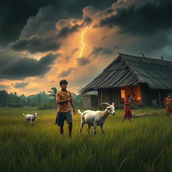 সেদিন ছিল সোমবার। বিদ্যালয় হইতে প্রত্যাবর্তন করিয়া দিপালীকে সঙ্গে লইয়া আমি মাঠে গমন করিয়াছিলাম, তাহাকে ঘাস খাওয়াইবার উদ্দেশ্যে। হঠাৎ দক্ষিণ-পূর্ব দিক হইতে প্রবল বায়ু প্রবাহিত হইতে লাগিল। অল্প সময়ের মধ্যেই আকাশমণ্ডল ঘন কালো মেঘে আচ্ছন্ন হইয়া পড়িল। প্রকৃতির শান্ত রূপ মুহূর্তেই যেন কঠোর ও ভয়ংকর রূপ ধারণ করিল—বৈশাখের কালবৈশাখী ঝড় আসিবার ইঙ্গিত স্পষ্ট হইয়া উঠিল।