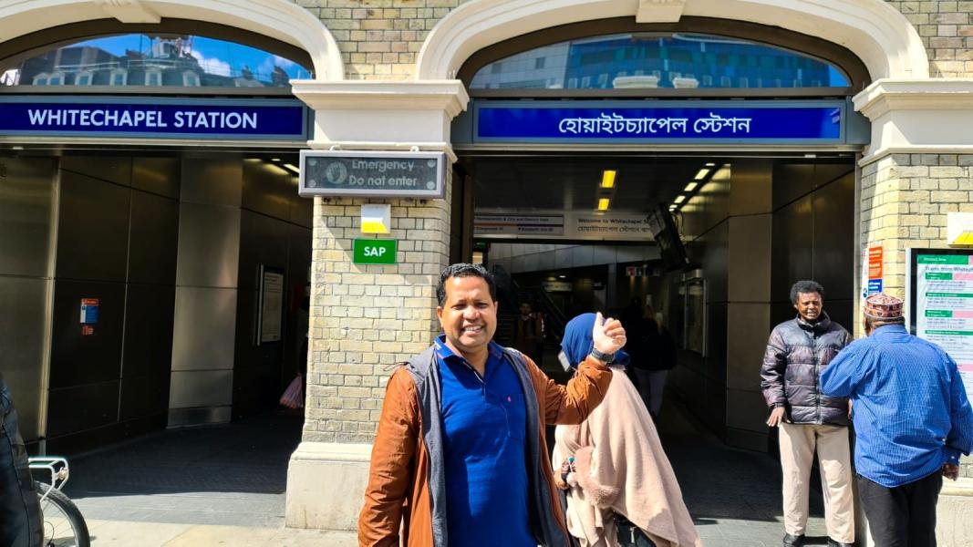 ২০২২ এর মে মাস। লন্ডনে ঢুকেই পরের দিন ইস্টলন্ডন এলাকায় চলে যাই। সাথে ছিলেন Kazi Milon ভাই। তিনি এই ছবি তোলেন। এর মাস দুয়েক আগে বাংলাদেশের স্বাধীনতা দিবসের আগে Whitechapel station এ ইংরেজির পাশাপাশি বাংলা নামও স্থাপন করা হয়।