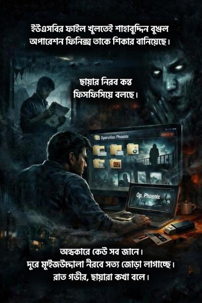 ইউএসবির ফাইলগুলো খুলতেই শাহাবুদ্দিনের শরীরে যেন বিদ্যুৎ খেলে গেল। অপারেশন ফিনিক্সের নামে কোডেড ফোল্ডার, তার ভিতরে ছবি, ডকুমেন্ট, আর রেকর্ডেড অডিও। প্রতিটি ফাইল যেন তার গোপন জীবনের খুঁটিনাটি বের করে আনছে, যা প্রকাশ পেলে তার পুরো সাম্রাজ্য ধ্বংস হতে পারে।