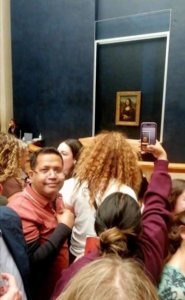 ঘুরতে ঘুরতে এক সময় সেই কাংখিত রুম ৭১১ তে চলে আসি। মানুষে গিজগিজ করছে। ফাঁকা হবে এমন সম্ভাবনাও দেখি না। সেলফি স্টিক দিয়ে মোনালিসার ছবি তুলতে যাই। নিরাপত্তা কর্মী মনে করিয়ে দেয়, সেটা করা যাবে না। বুলেট প্রুফ গ্লাসের ভিতরে রাখা মোনালিসা। মোবাইলে ছবি তুলি, ভিডিও করি। কিন্তু পিছনে মোনালিসা মিটিমিটি হাসছে, দাঁত কেলিয়ে সামনে দাঁড়িয়ে আমি। এমন একটা ছবি না থাকলে কি হয়! মনিরের কাছে মোবাইল দিয়ে সামনে এগিয়ে যাই। কিন্তু কোনভাবে একটা যুতসই ছবি নেয়া যাচ্ছে না।
